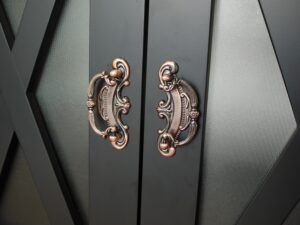 クロスデザインの木材にガラス窓をあしらい、アンティーク調の取手をつけています。