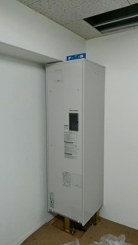 今回ご用意いただいたのは貯水式の電気温水器。MKのシャワーユニットはガス給湯器でも電気温水器でもどちらでも利用可能です。