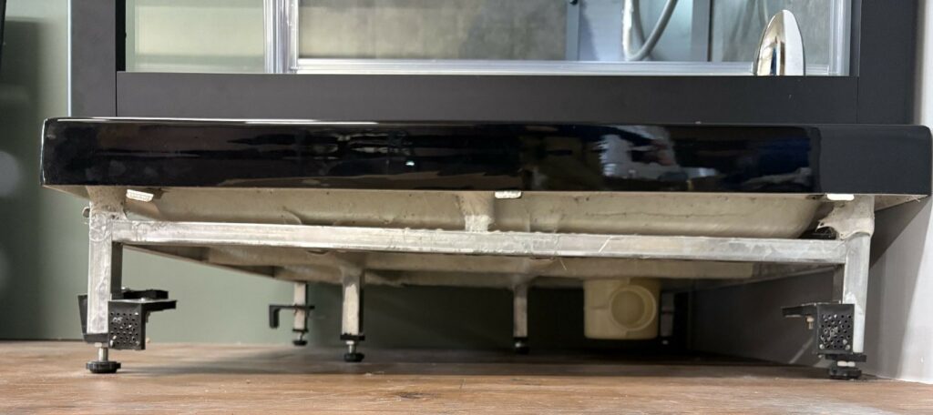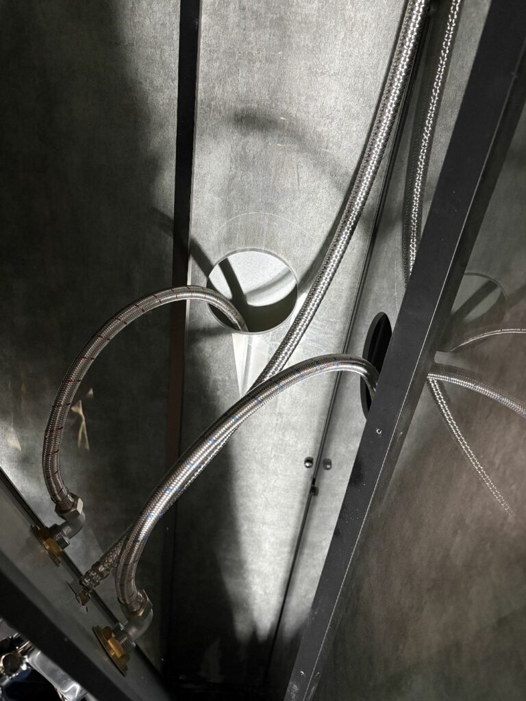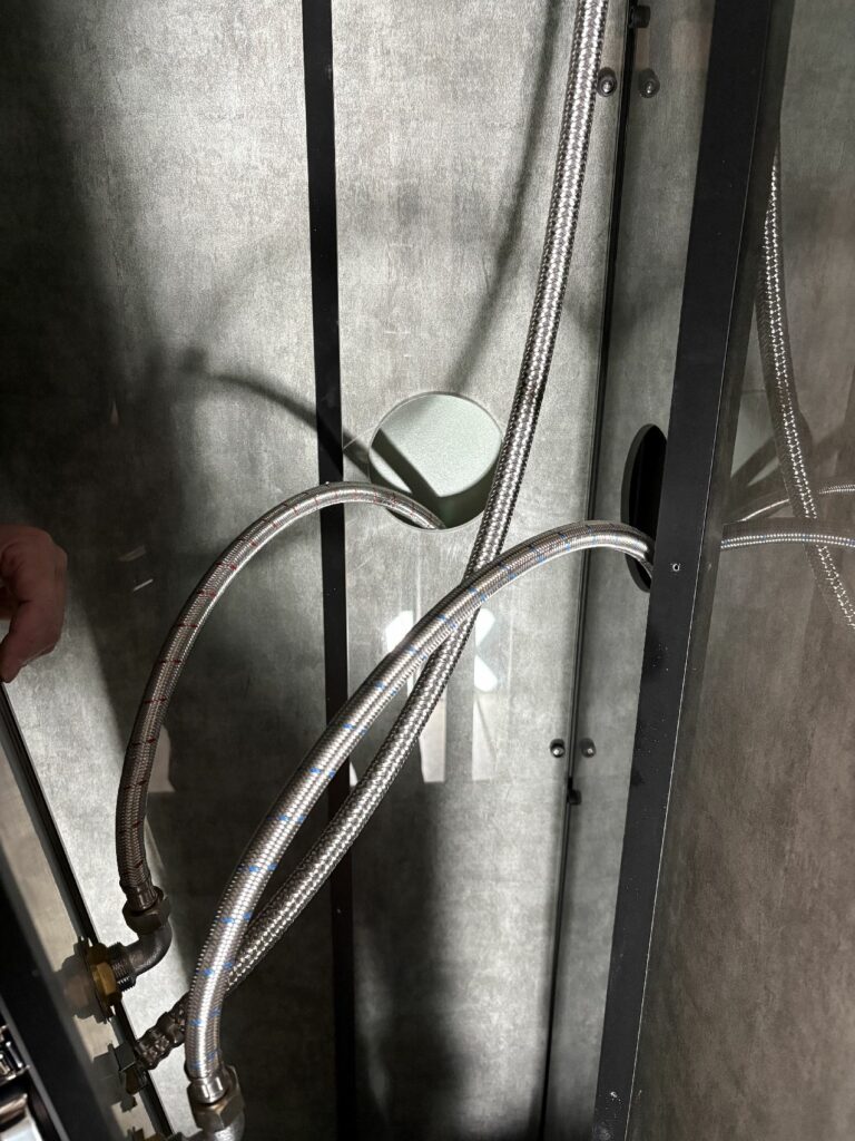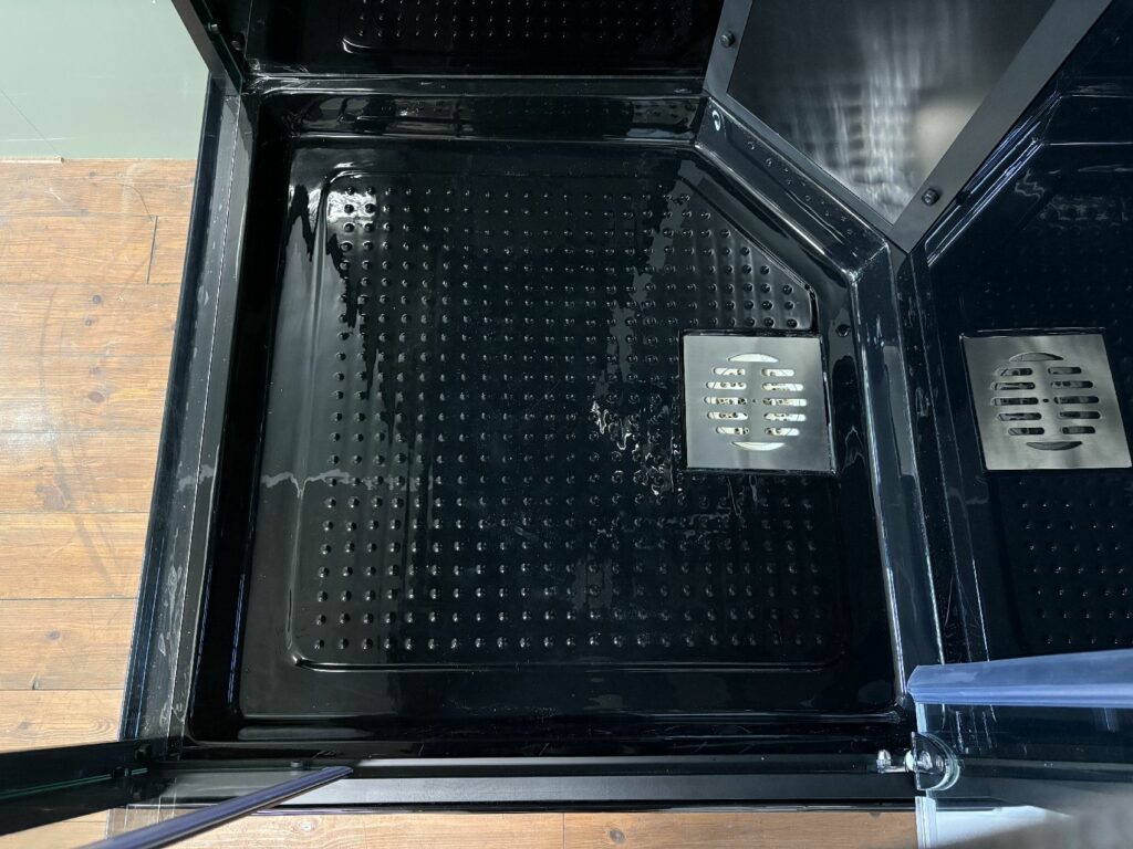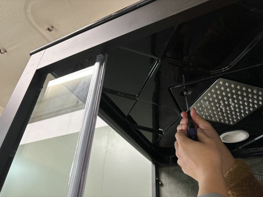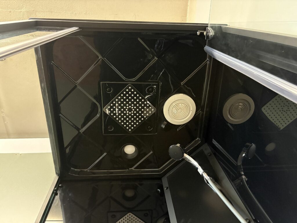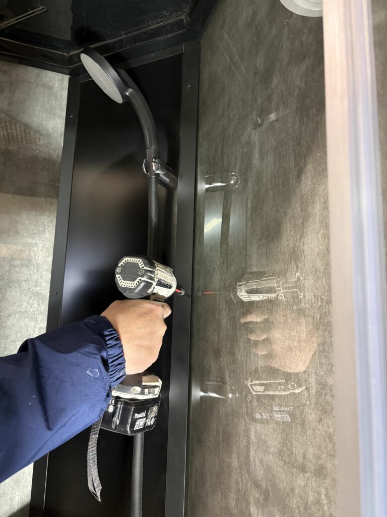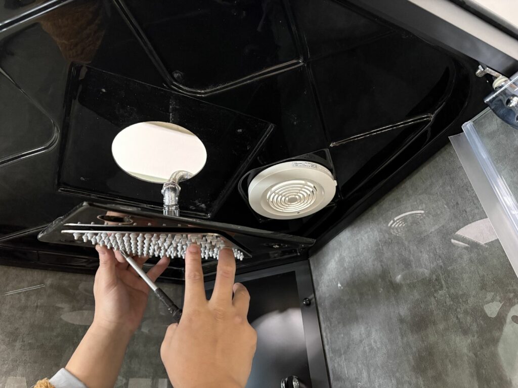 ブースの中から、給湯給水やレインシャワーのメンテナンスができ、ベースエプロンが外れ、排水の点検もできます。