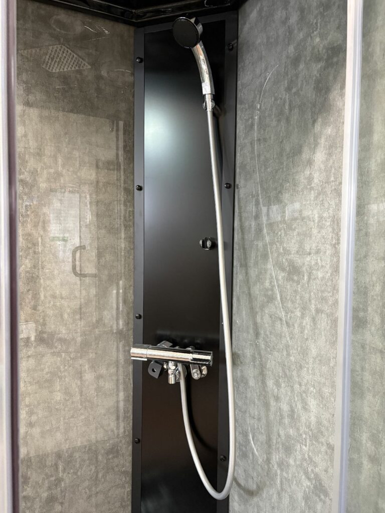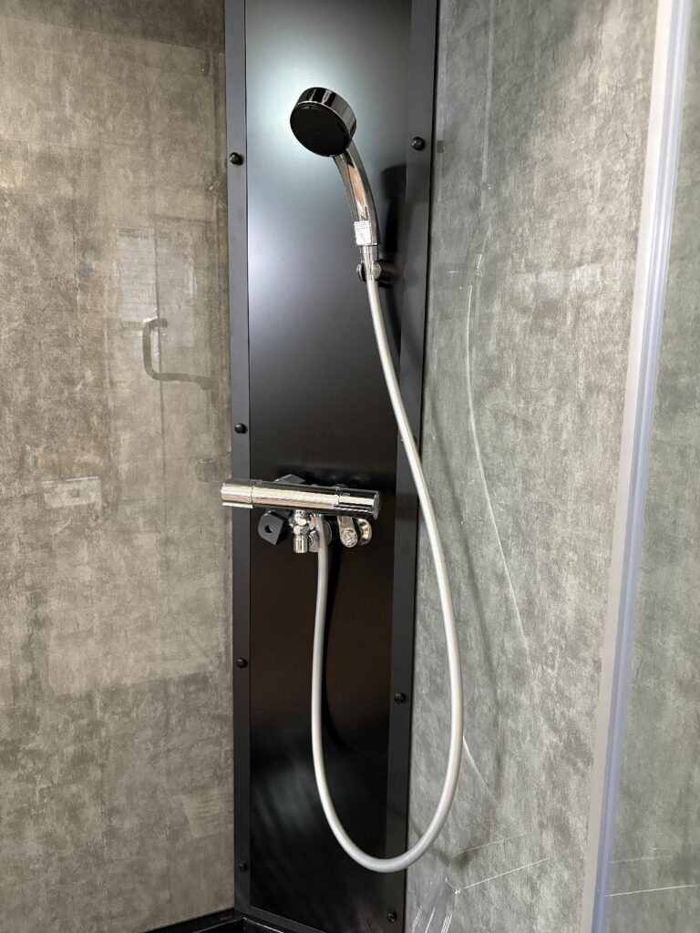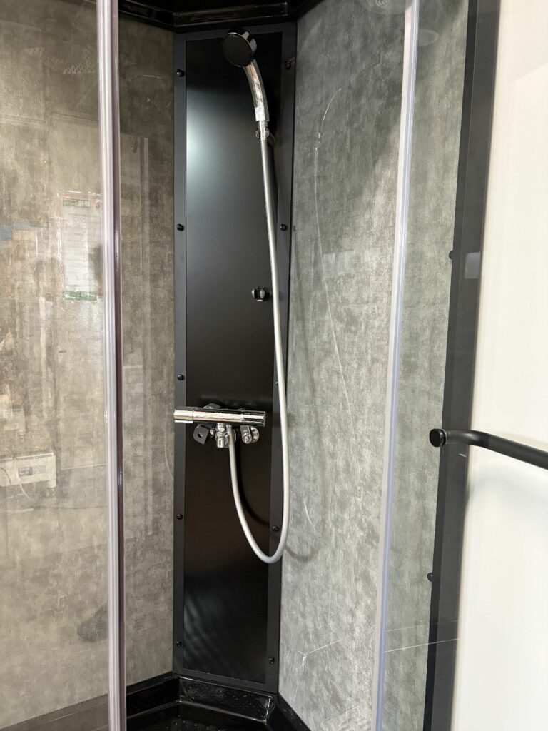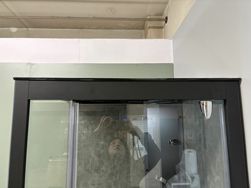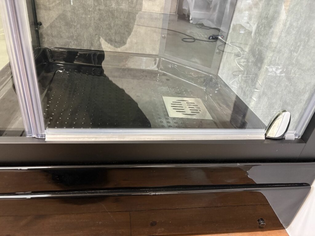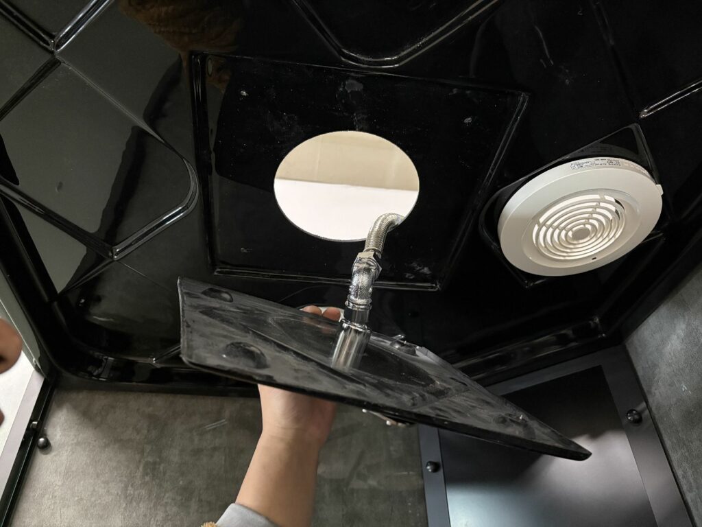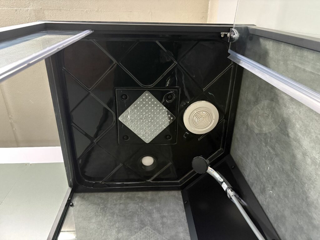 ブースの中から、給湯給水やレインシャワーのメンテナンスができ、ベースエプロンが外れ、排水の点検もできます。