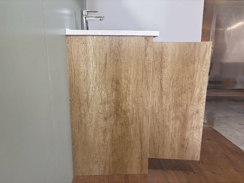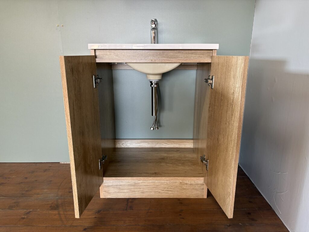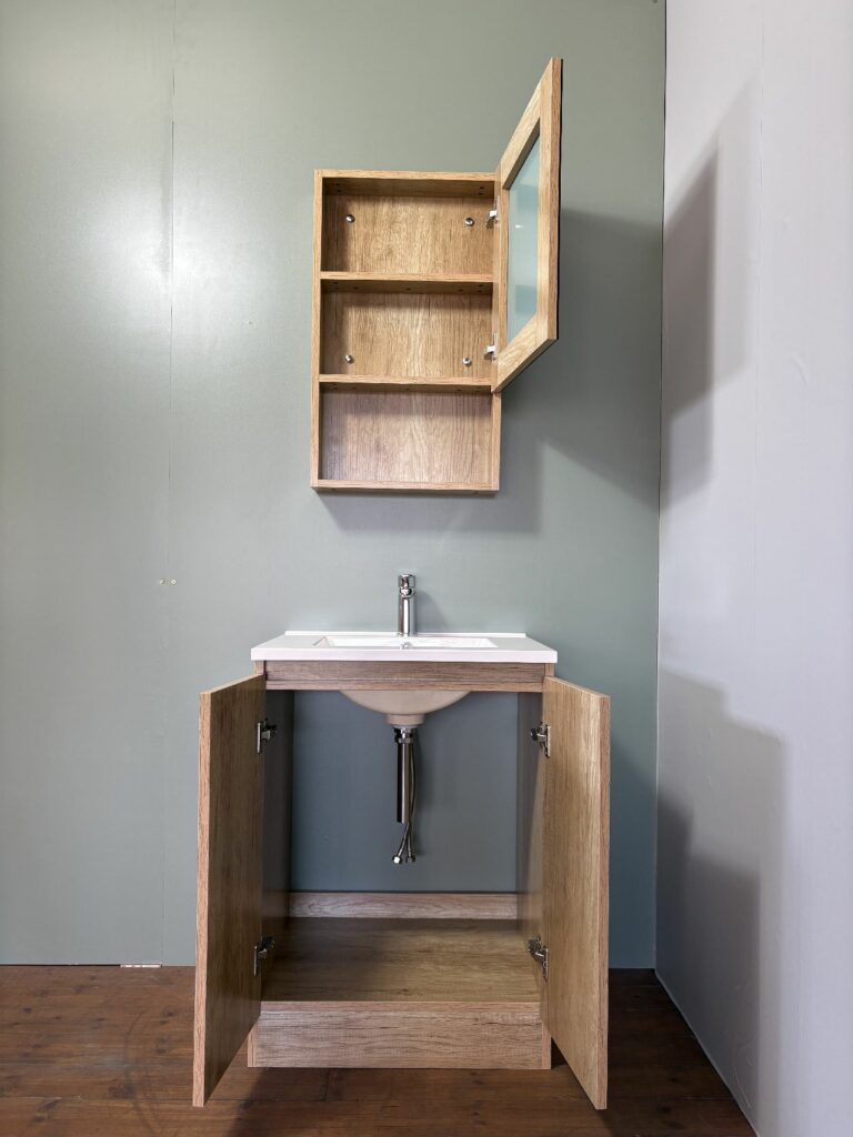 観音開きで、下台のスペースに小型温水器も収容できるスペースもあります。