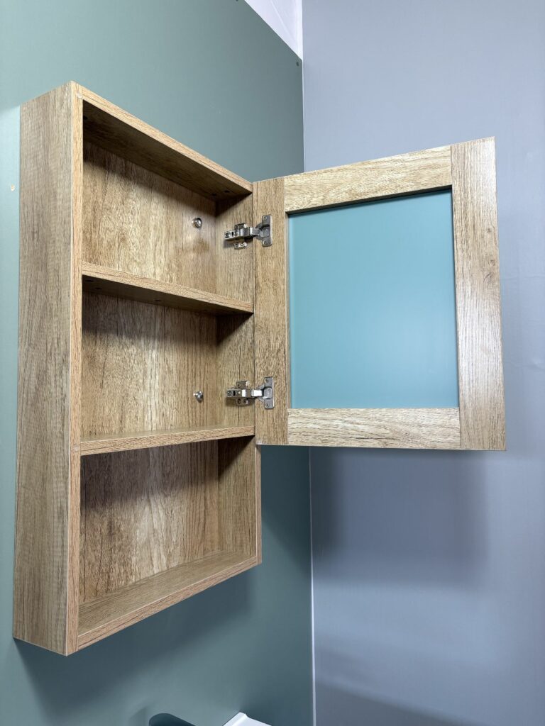 鏡扉を開けると、収納棚が2段あり、小物の収納には十分です。