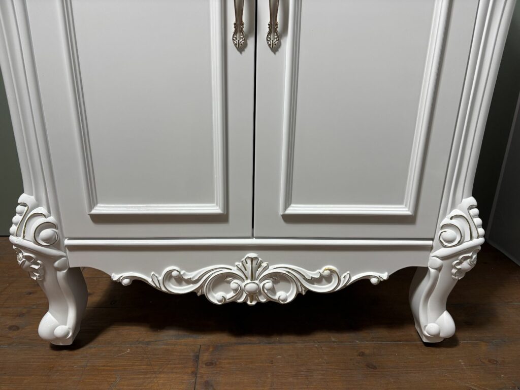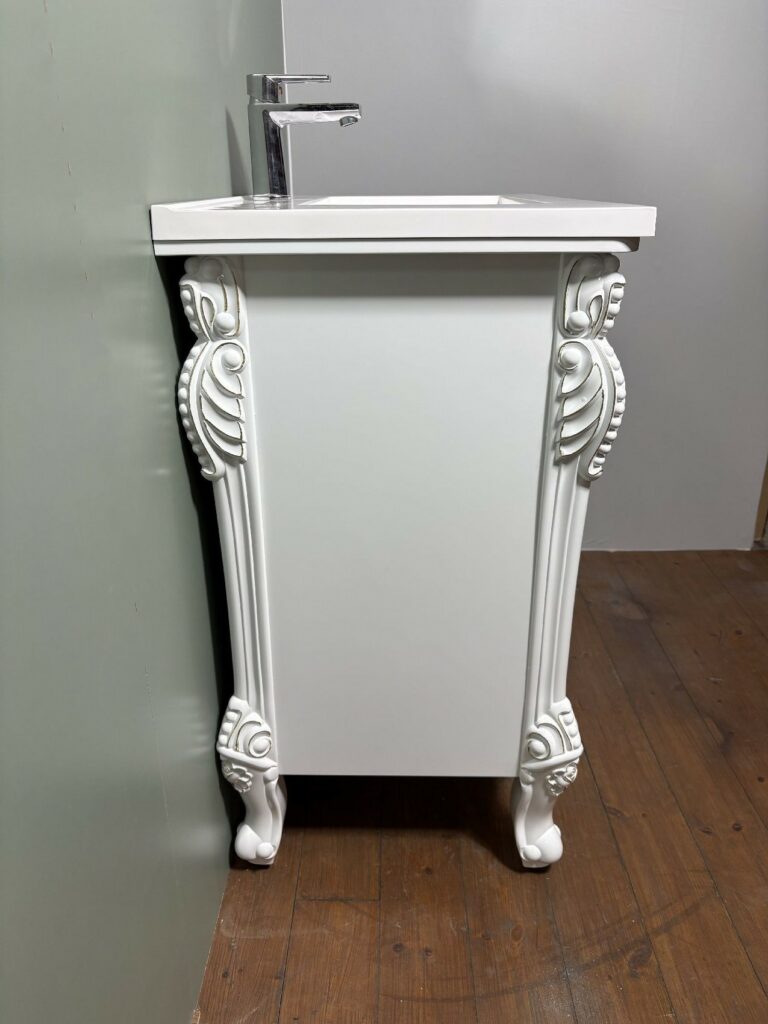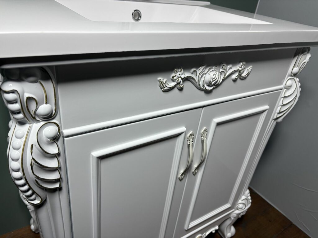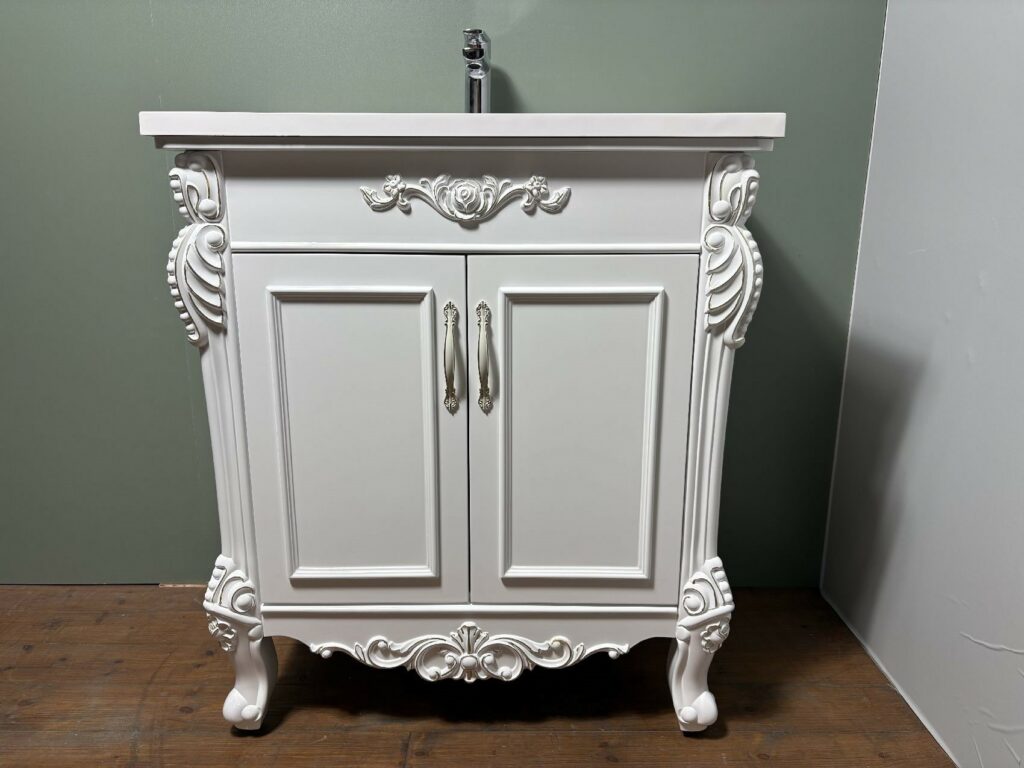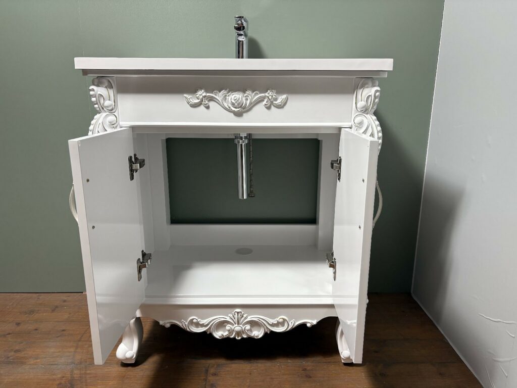 白ベースに、金の塗装で縁取られ、エレガントで、華やかな洗面台です。