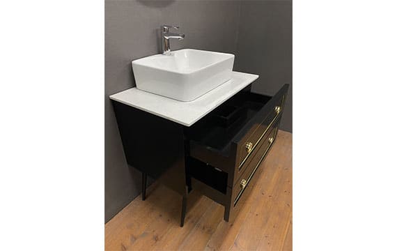 黒地にゴールドのラインと丸取っ手が引き立つ、アンティークなデザインの洗面台です。