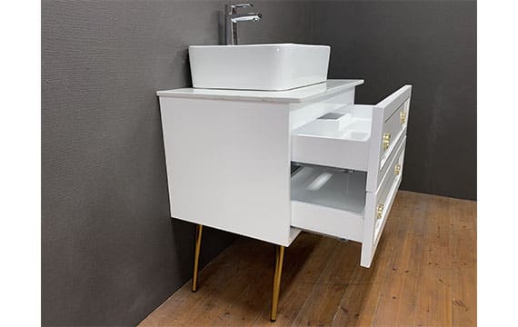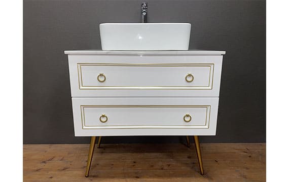 白地にゴールドのラインと丸取っ手が引き立つ、アンティークなデザインの洗面台です。